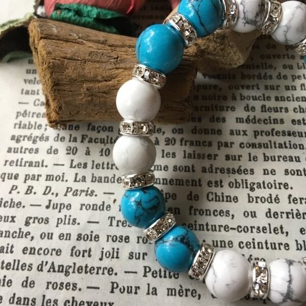 こちらは、ターコイズとハウライトのミックスブレスレットです。石はターコイズとハウライトを使用して間にはシルバーのロンデルで高級感溢れるデザインに仕上がっています。石大きさは腕にも馴染みやすいように10mm玉で内周約17cm(伸可能)です。気になる方は是非この機会にどうぞ。
