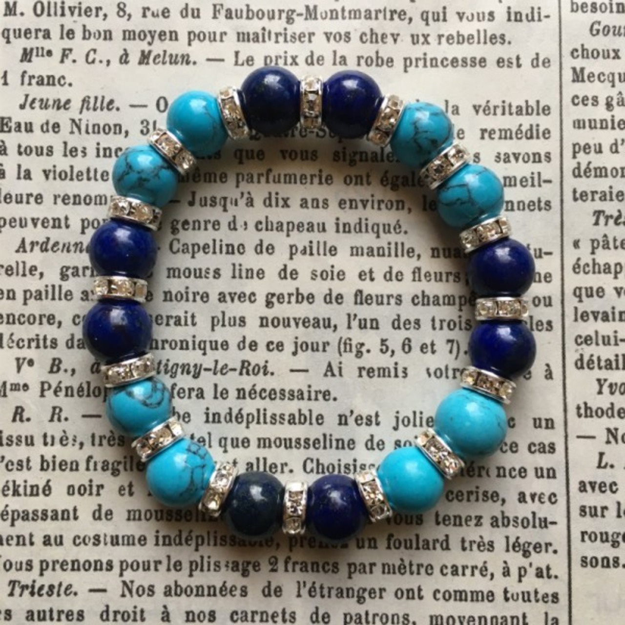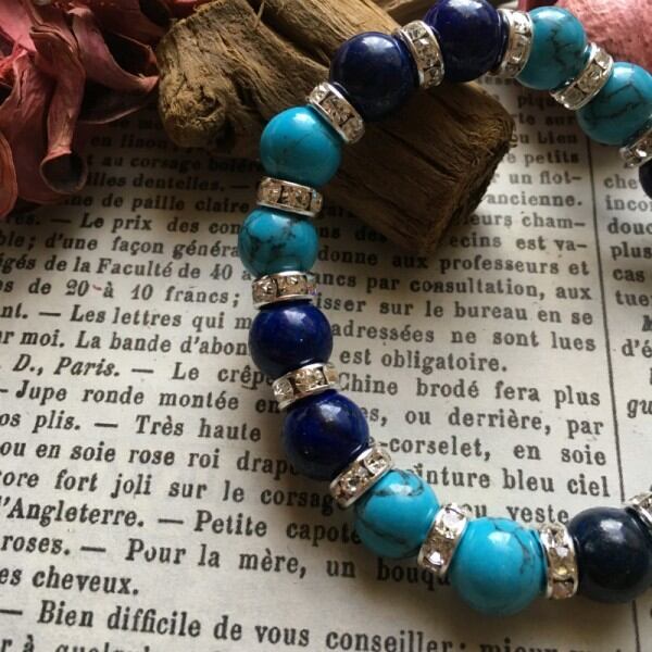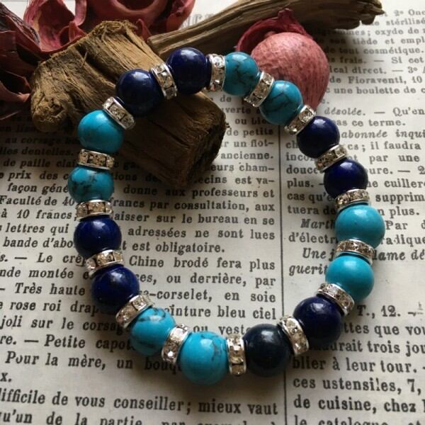 こちらは、ラピスラズリとターコイズを組み合わせた天然石ブレスレットです。間にはシルバーロンデルを挟み高級感あるデザインに仕上げています。石大きさは腕にも馴染みやすいように10mm玉で内周約17cm(伸可能)です。気になる方は是非この機会にどうぞ。