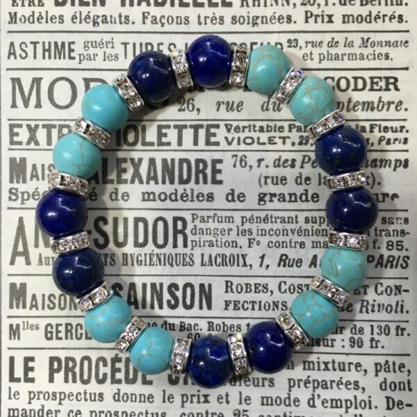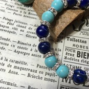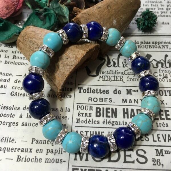 こちらは、ラピスラズリとハウライトを組み合わせた天然石ブレスレットです。間にはシルバーの8mmロンデルを挟み高級感あるデザインに仕上げています。石大きさは腕にも馴染みやすいように10mm玉で内周約17cm(伸可能)です。気になる方は是非この機会にどうぞ。