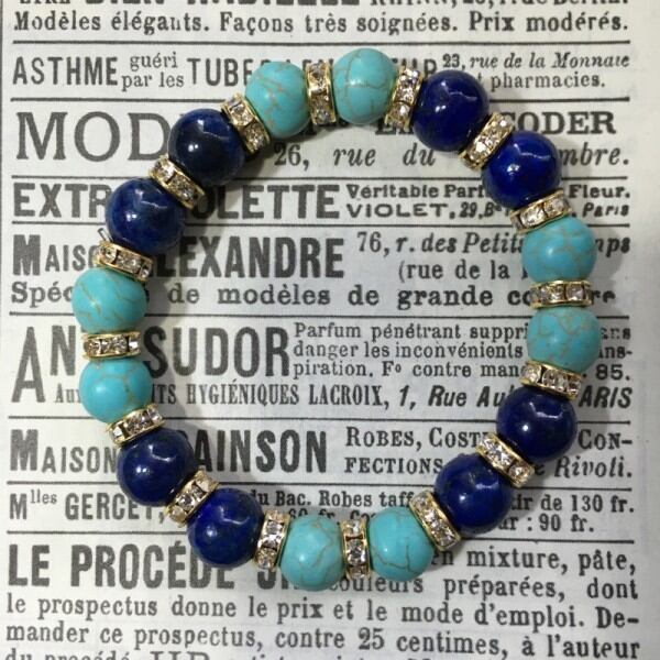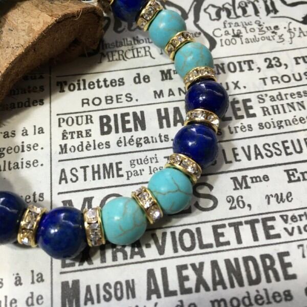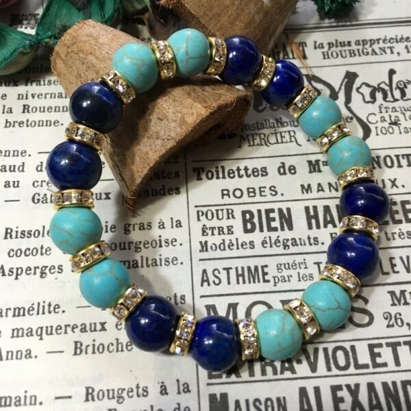 こちらは、ラピスラズリとハウライトを組み合わせた天然石ブレスレットです。間にはゴールドの8mmロンデルを挟み高級感あるデザインに仕上げています。石大きさは腕にも馴染みやすいように10mm玉で内周約17cm(伸可能)です。気になる方は是非この機会にどうぞ。