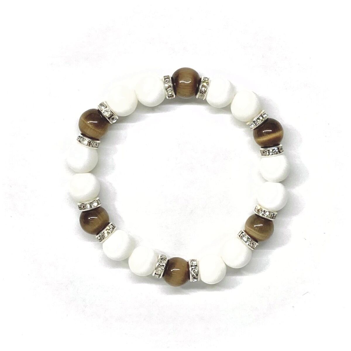 こちらは、キャッツアイとホワイトオニキスを組み合わせたブレスレットです。間にはロンデルを挟み高級感あるデザインに仕上がっています。石大きさは腕にも馴染みやすいように10mm玉で内周約16cm(伸可能)です。数に限りがございますので気になる方はお早めにどうぞ。