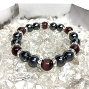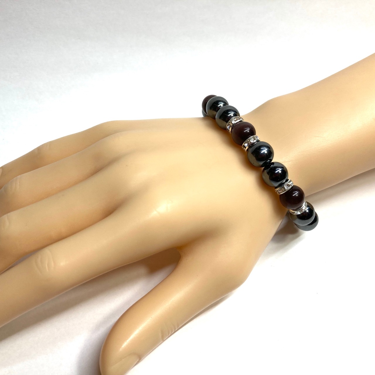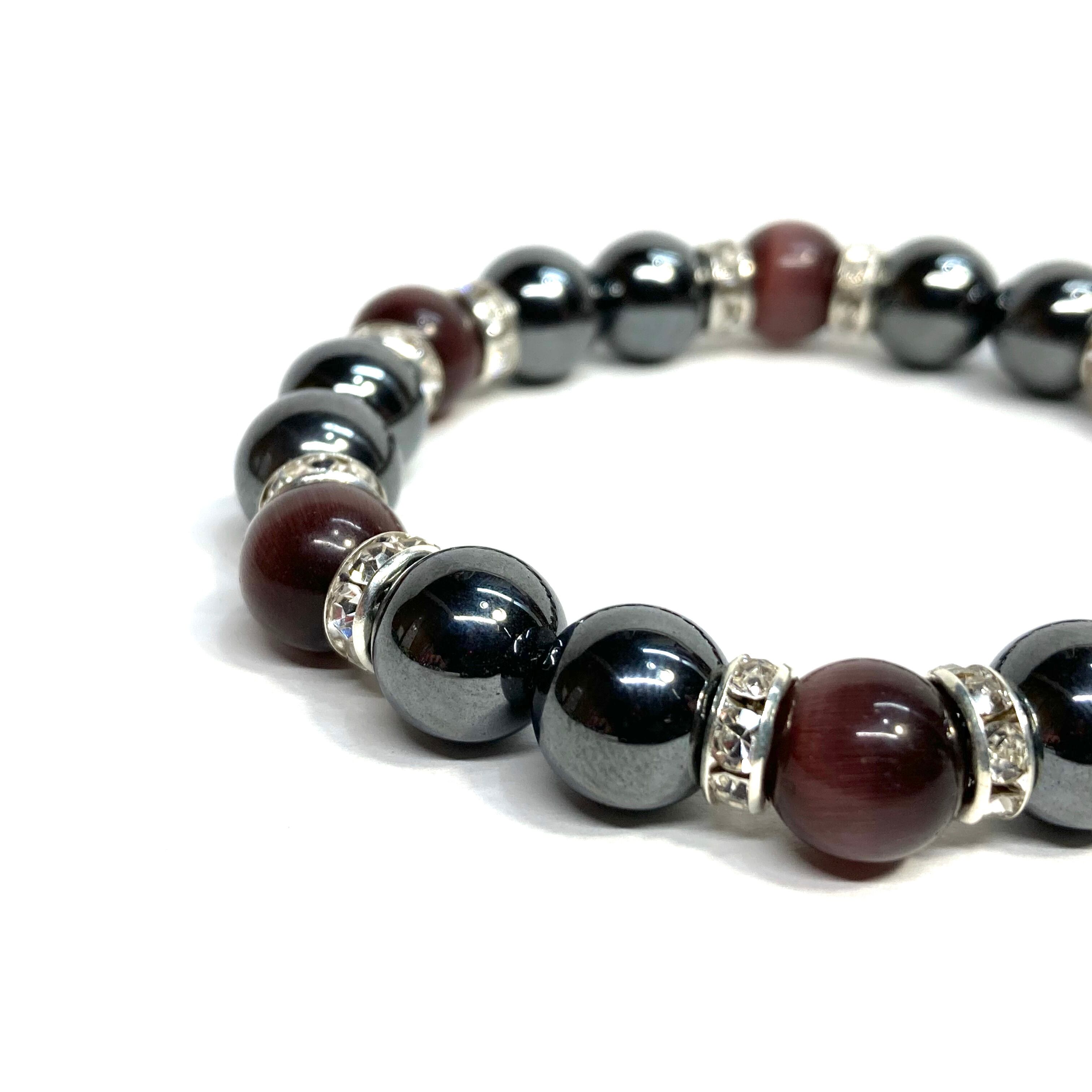 こちらは、キャッツアイとヘマタイトを組み合わせたブレスレットです。間にはロンデルを挟み高級感あるデザインに仕上がっています。石大きさは腕にも馴染みやすいように10mm玉で内周約16cm(伸可能)です。数に限りがございますので気になる方はお早めにどうぞ。