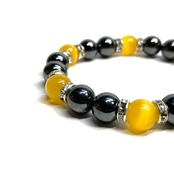 こちらは、キャッツアイとヘマタイトを組み合わせたブレスレットです。間にはロンデルを挟み高級感あるデザインに仕上がっています。石大きさは腕にも馴染みやすいように10mm玉で内周約16cm(伸可能)です。数に限りがございますので気になる方はお早めにどうぞ。