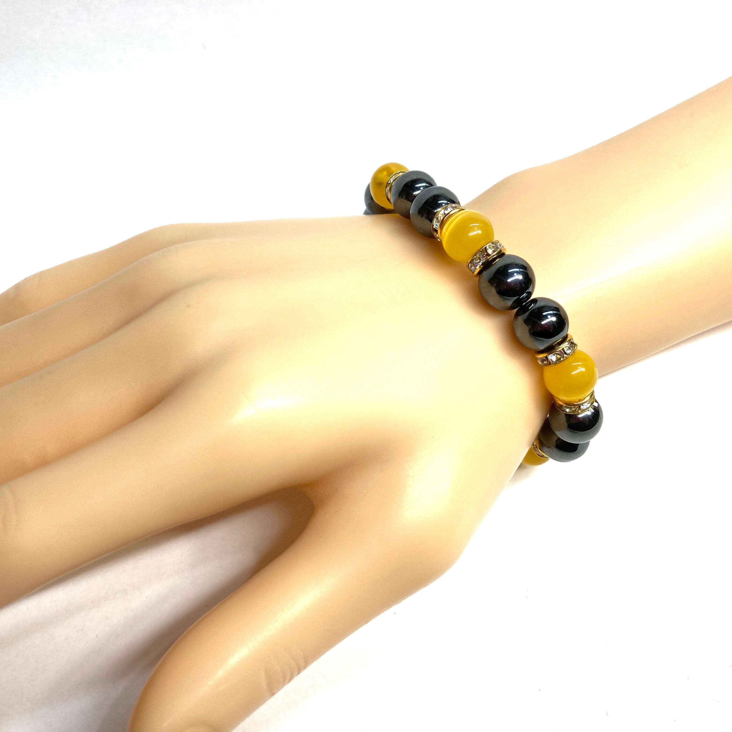 こちらは、キャッツアイとヘマタイトを組み合わせたブレスレットです。間にはロンデルを挟み高級感あるデザインに仕上がっています。石大きさは腕にも馴染みやすいように10mm玉で内周約16cm(伸可能)です。数に限りがございますので気になる方はお早めにどうぞ。