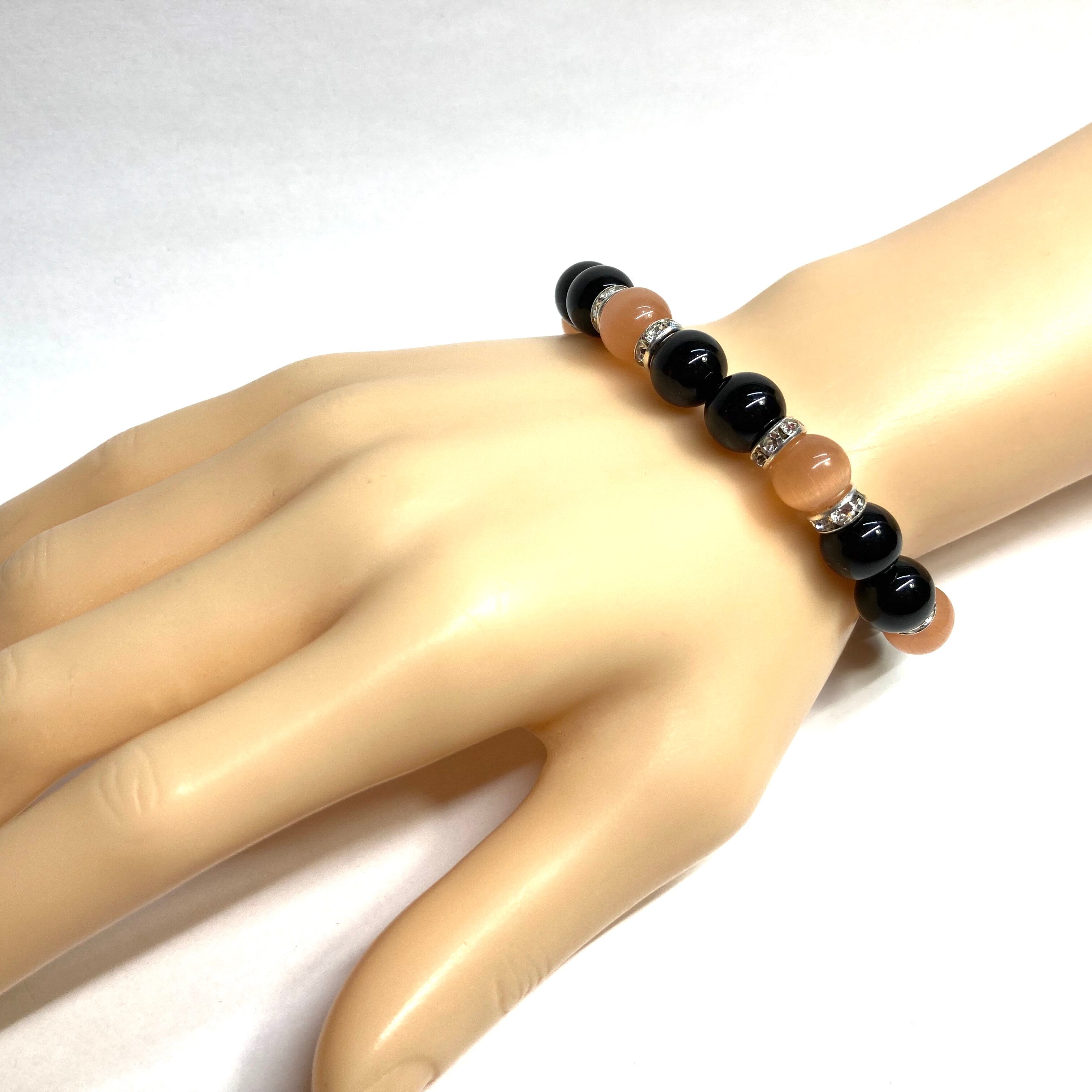 こちらは、キャッツアイとオニキスを組み合わせたブレスレットです。間にはロンデルを挟み高級感あるデザインに仕上がっています。石大きさは腕にも馴染みやすいように10mm玉で内周約16cm(伸可能)です。数に限りがございますので気になる方はお早めにどうぞ。