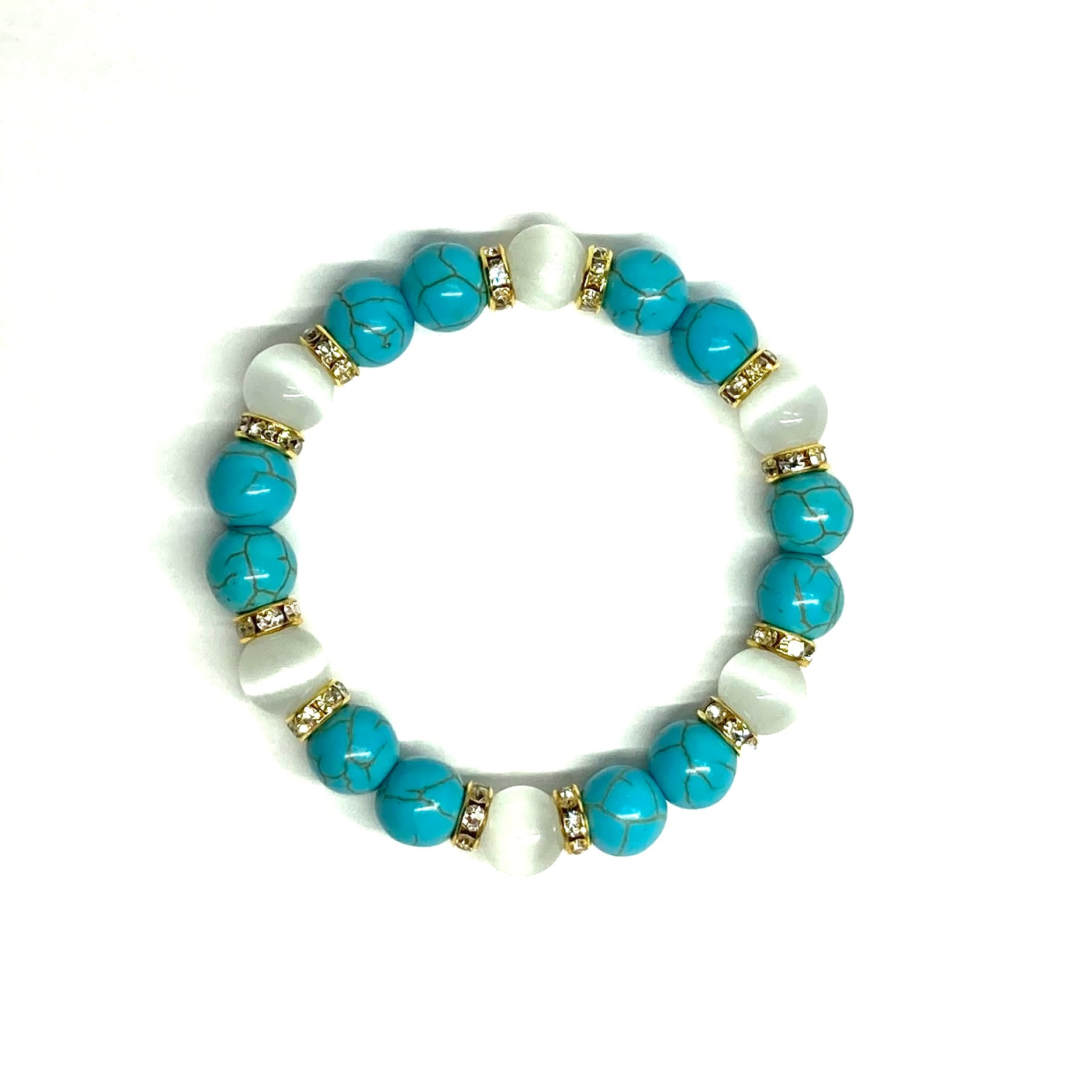 こちらは、キャッツアイとターコイズを組み合わせたブレスレットです。間にはロンデルを挟み高級感あるデザインに仕上がっています。石大きさは腕にも馴染みやすいように10mm玉で内周約16cm(伸可能)です。数に限りがございますので気になる方はお早めにどうぞ。