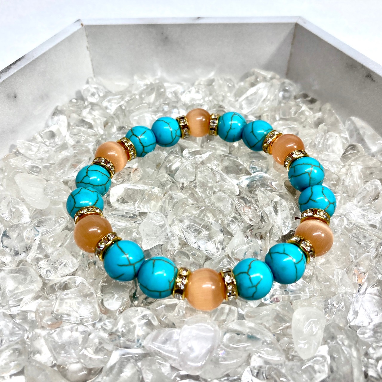 こちらは、キャッツアイとターコイズを組み合わせたブレスレットです。間にはロンデルを挟み高級感あるデザインに仕上がっています。石大きさは腕にも馴染みやすいように10mm玉で内周約16cm(伸可能)です。数に限りがございますので気になる方はお早めにどうぞ。