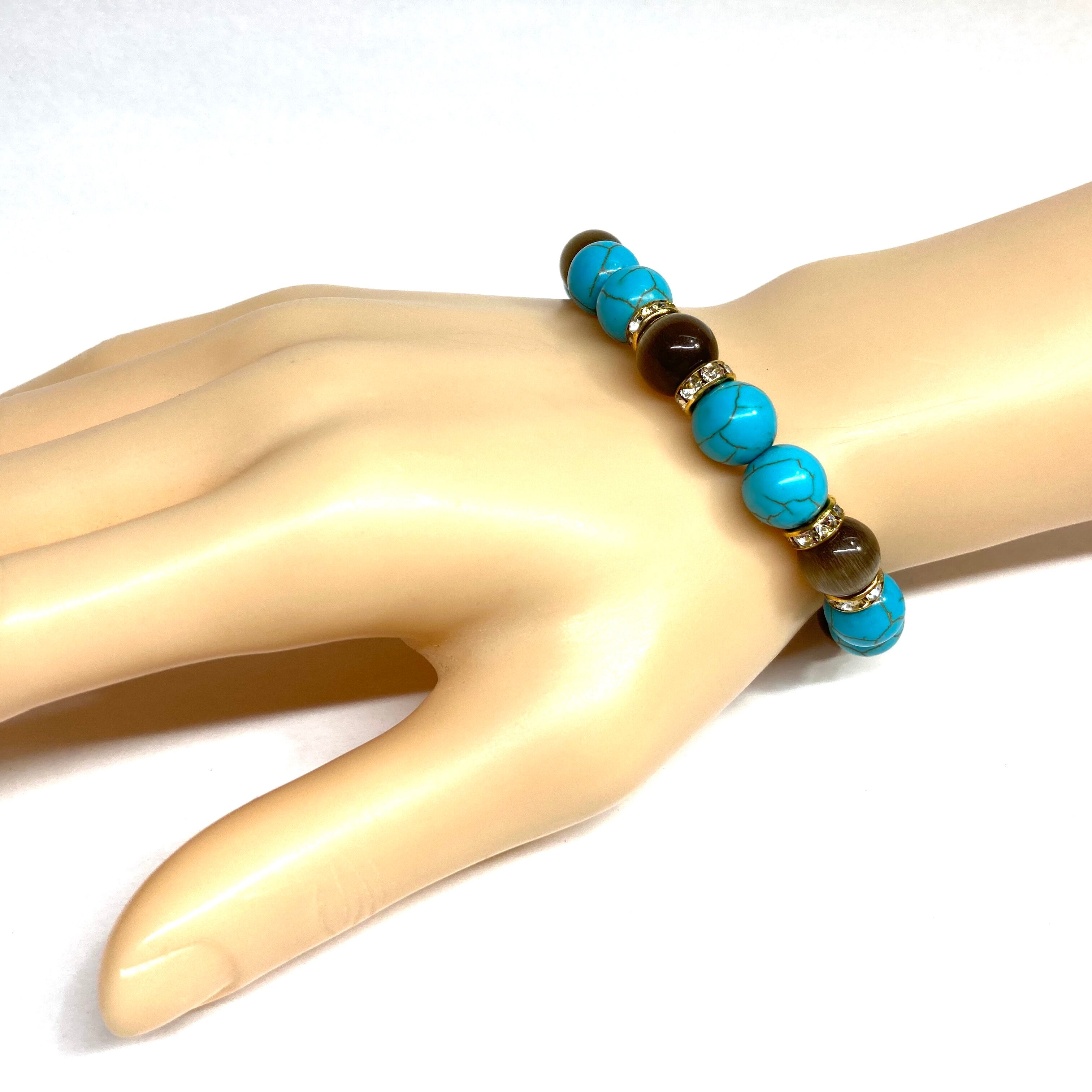 こちらは、キャッツアイとターコイズを組み合わせたブレスレットです。間にはロンデルを挟み高級感あるデザインに仕上がっています。石大きさは腕にも馴染みやすいように10mm玉で内周約16cm(伸可能)です。数に限りがございますので気になる方はお早めにどうぞ。