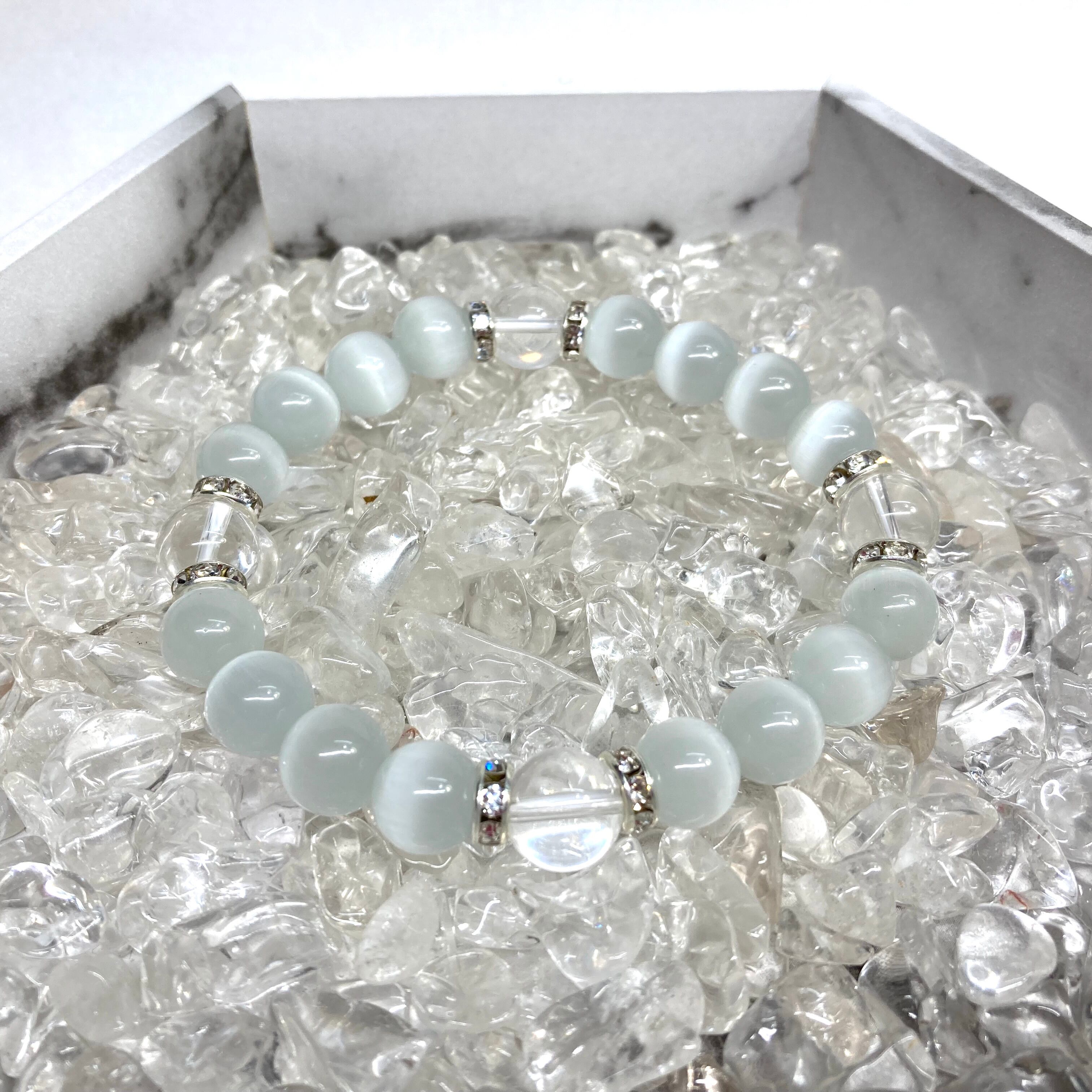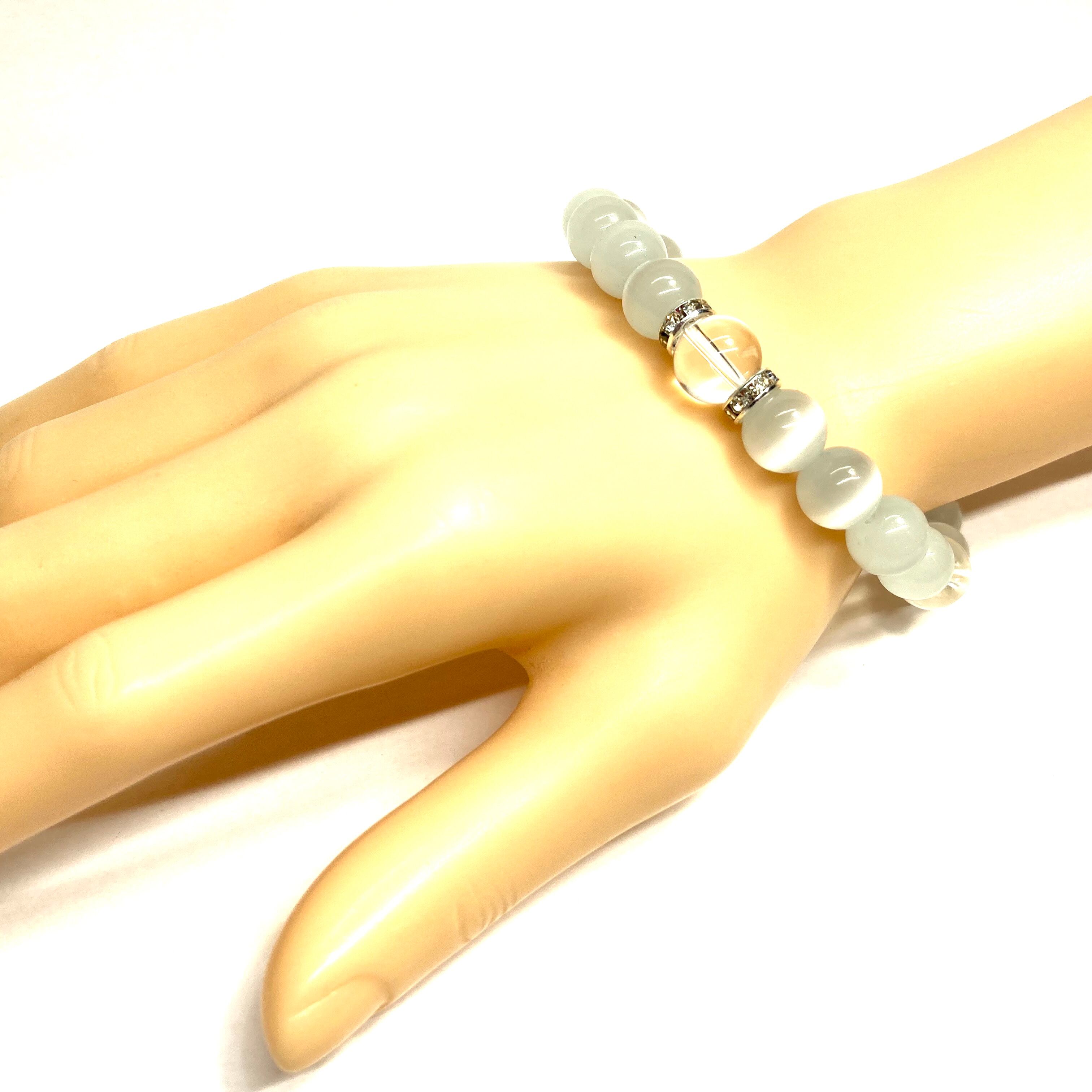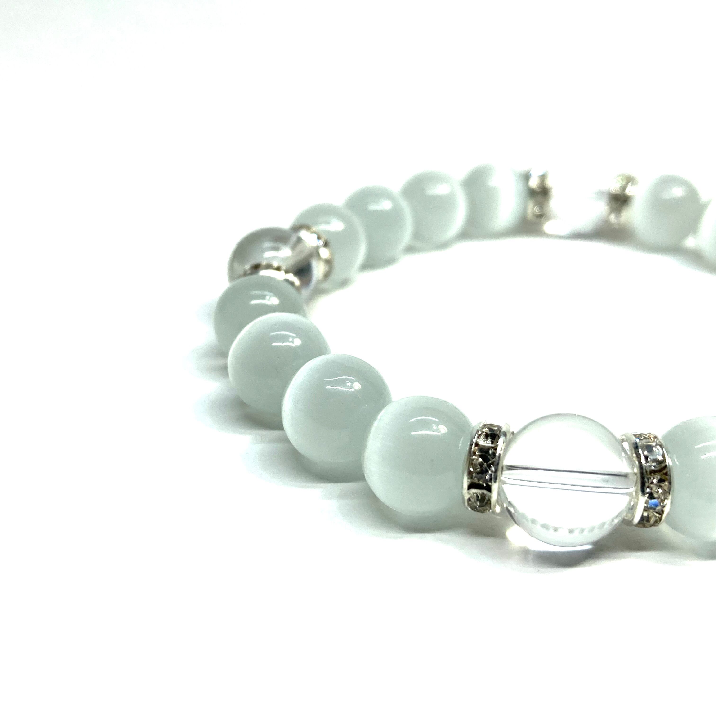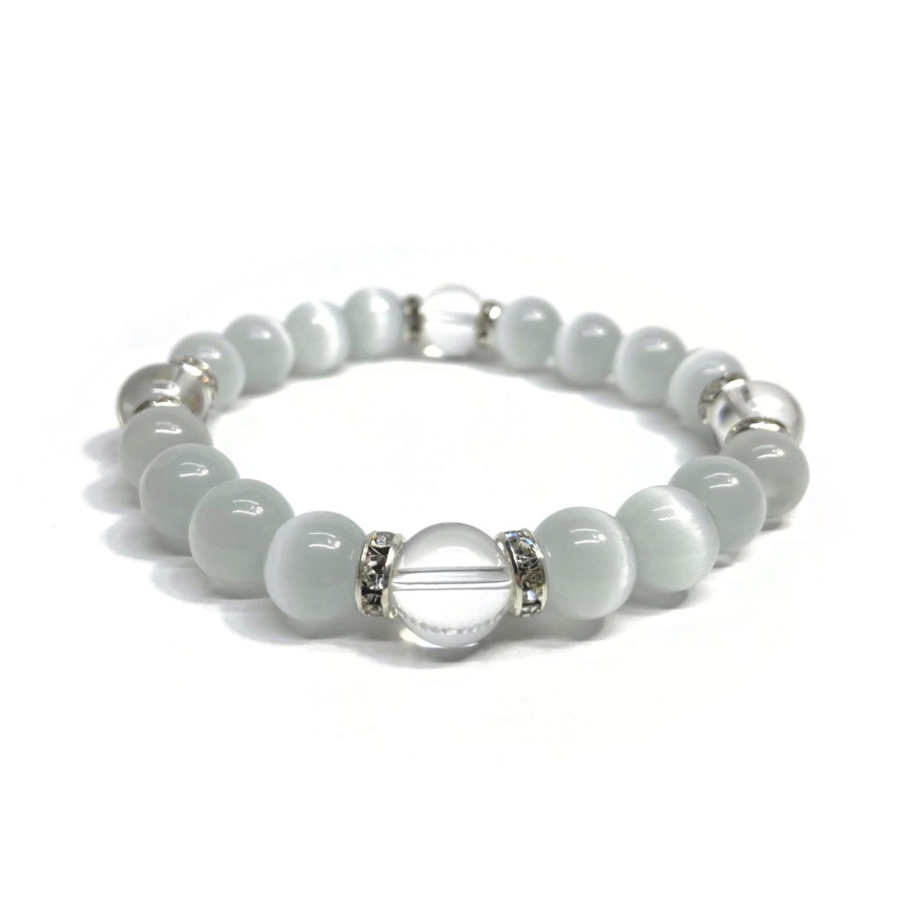 キャッツアイ(ホワイト)×水晶 パワーストーン ブレスレット (シルバー) メンズ・レディース 男性・女性 数珠ブレス 開運