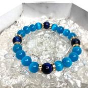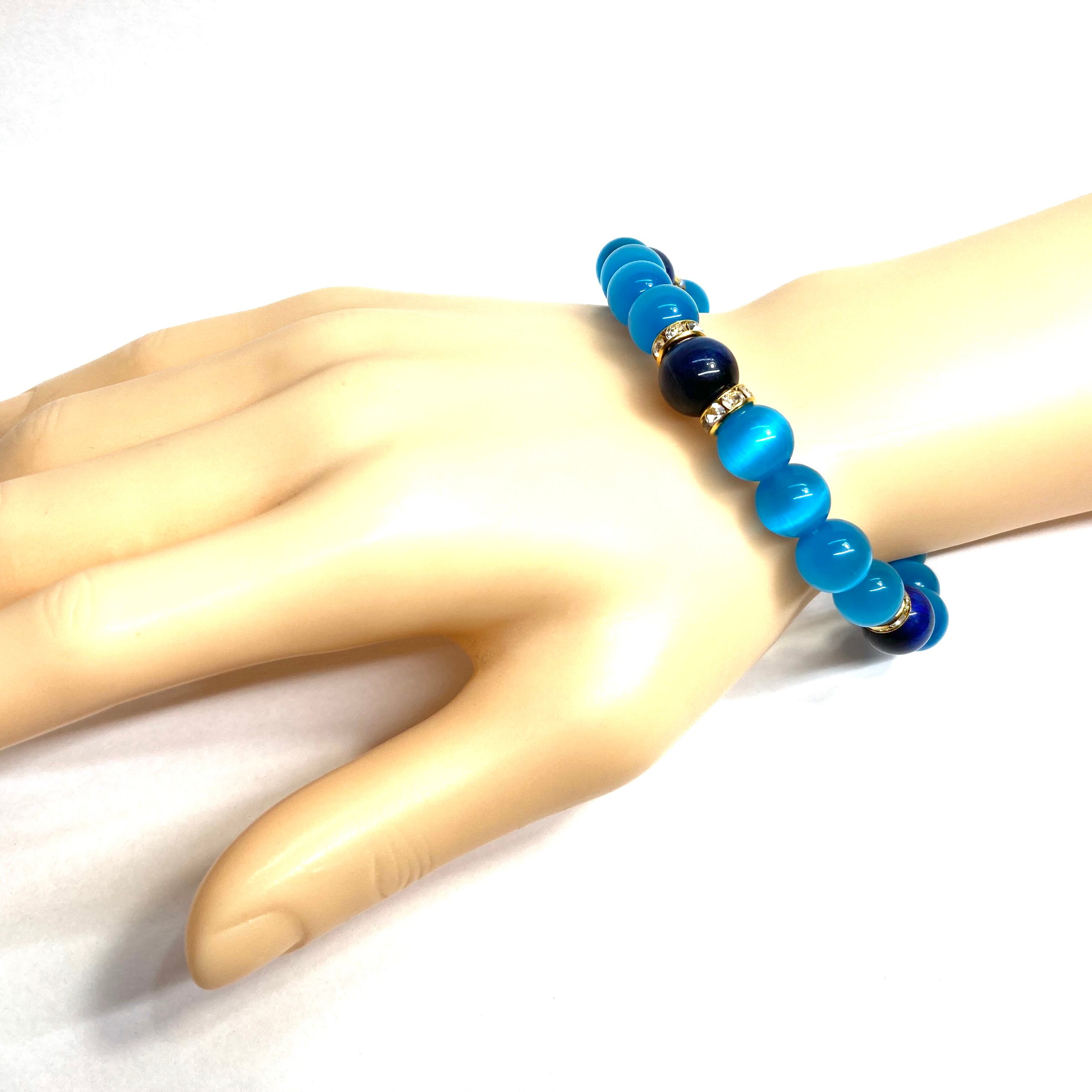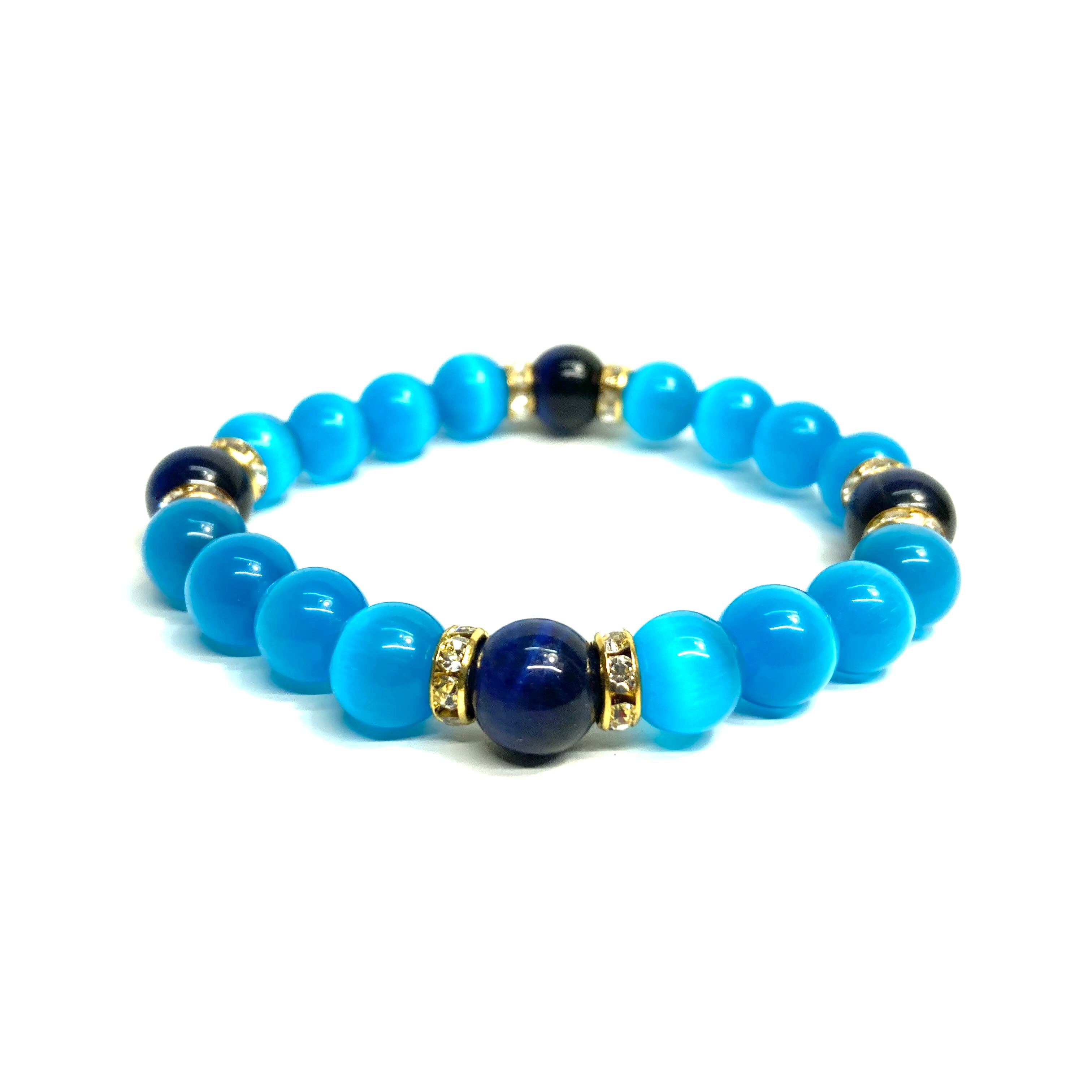 こちらは、キャッツアイとブルータイガーアイを組み合わせたブレスレットです。間にはロンデルを挟み高級感あるデザインに仕上がっています。石大きさは腕にも馴染みやすいように10mm玉で内周約17cm(伸可能)です。数に限りがございますので気になる方はお早めにどうぞ。