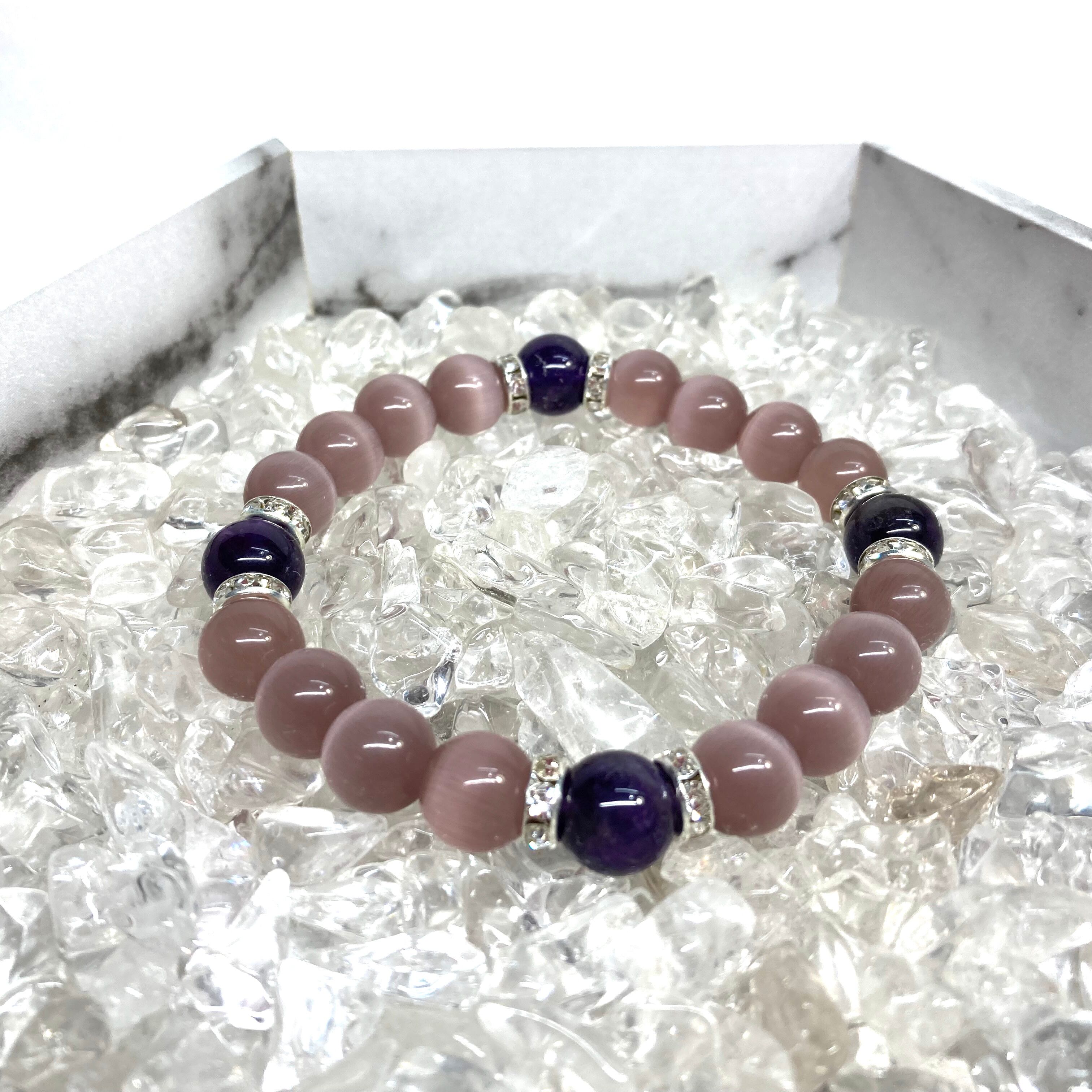 こちらは、キャッツアイとアメジストを組み合わせたブレスレットです。間にはロンデルを挟み高級感あるデザインに仕上がっています。石大きさは腕にも馴染みやすいように10mm玉で内周約17cm(伸可能)です。数に限りがございますので気になる方はお早めにどうぞ。