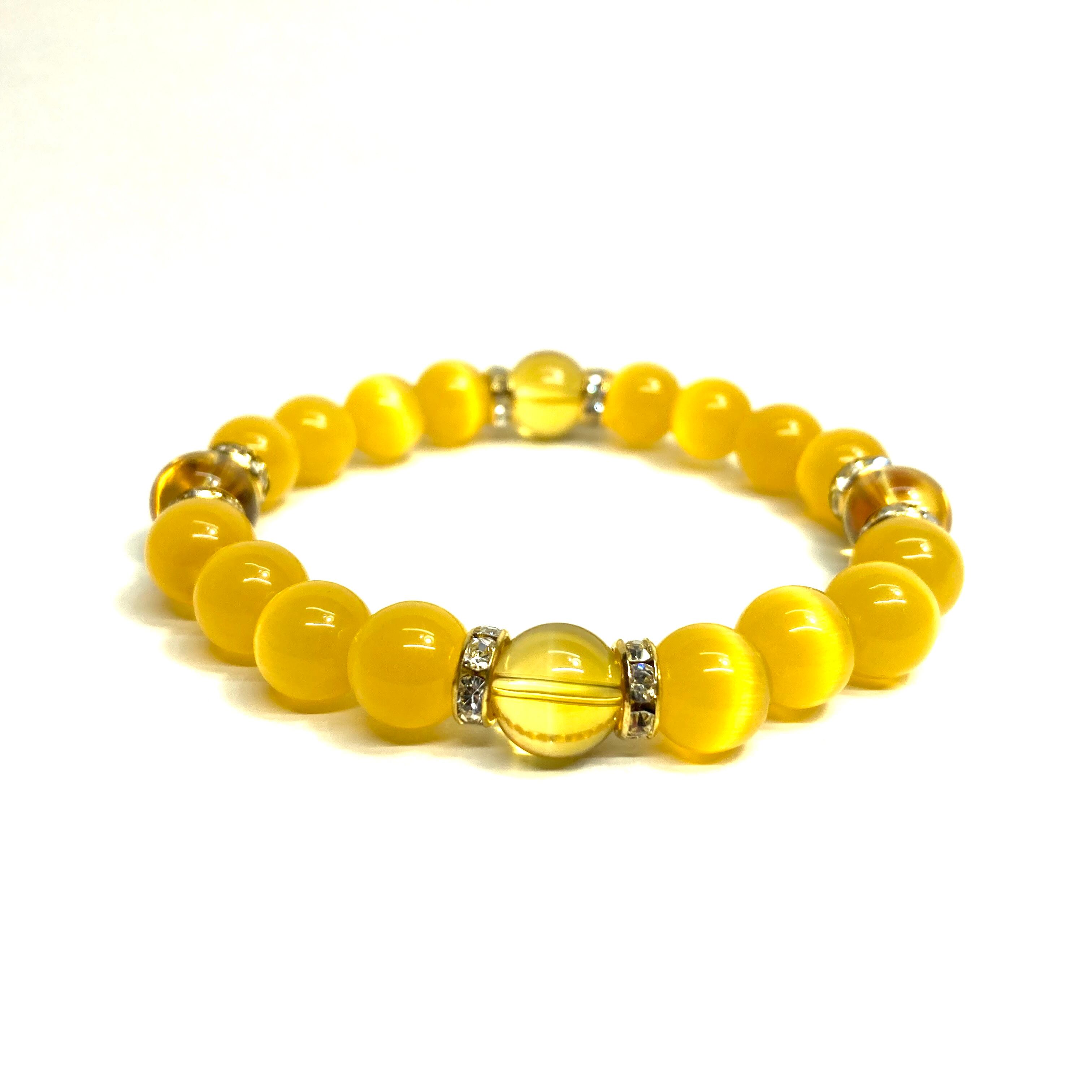 こちらは、キャッツアイとシトリンを組み合わせたブレスレットです。間にはロンデルを挟み高級感あるデザインに仕上がっています。石大きさは腕にも馴染みやすいように10mm玉で内周約17cm(伸可能)です。数に限りがございますので気になる方はお早めにどうぞ。