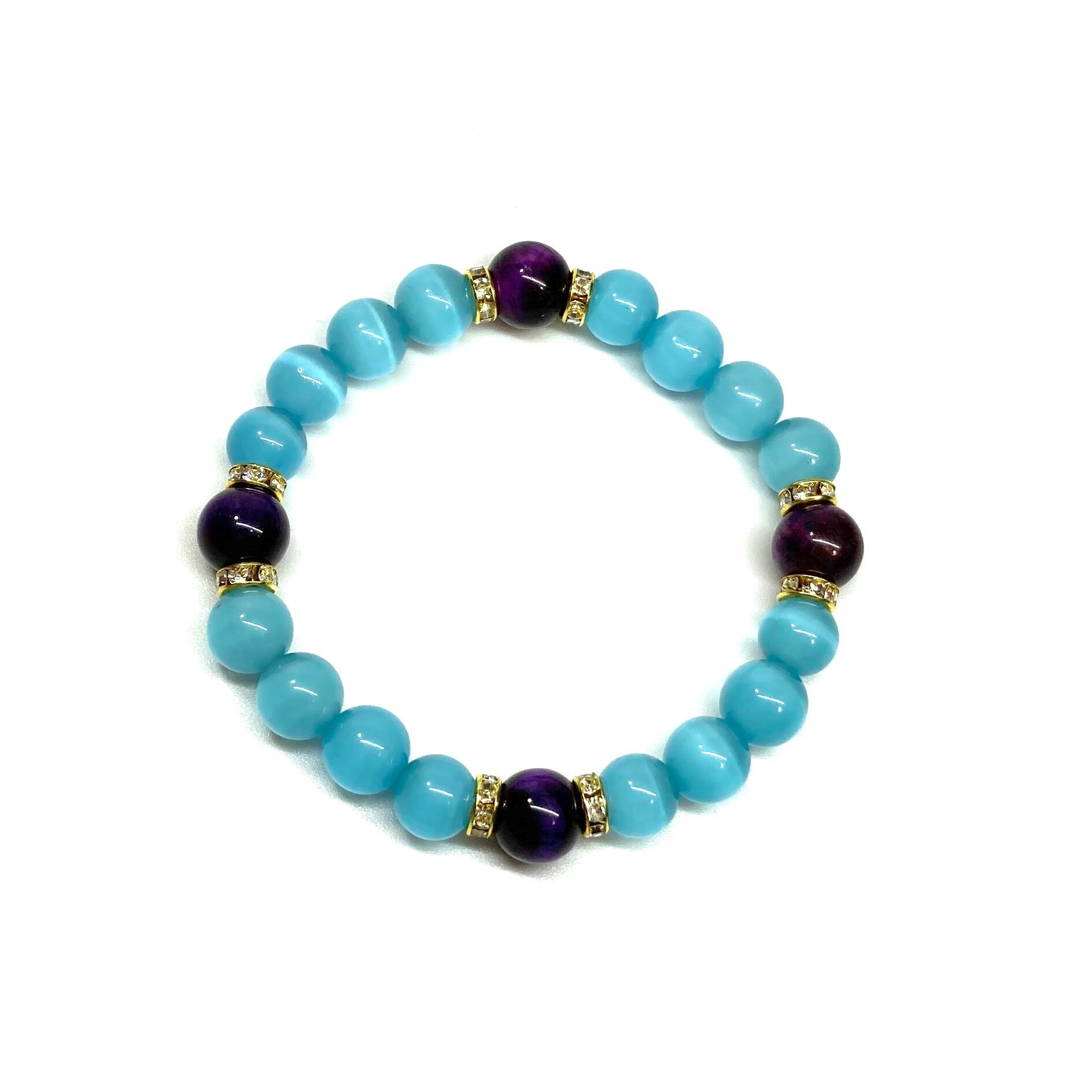 こちらは、キャッツアイとパープルタイガーアイを組み合わせたブレスレットです。間にはロンデルを挟み高級感あるデザインに仕上がっています。石大きさは腕にも馴染みやすいように10mm玉で内周約17cm(伸可能)です。数に限りがございますので気になる方はお早めにどうぞ。