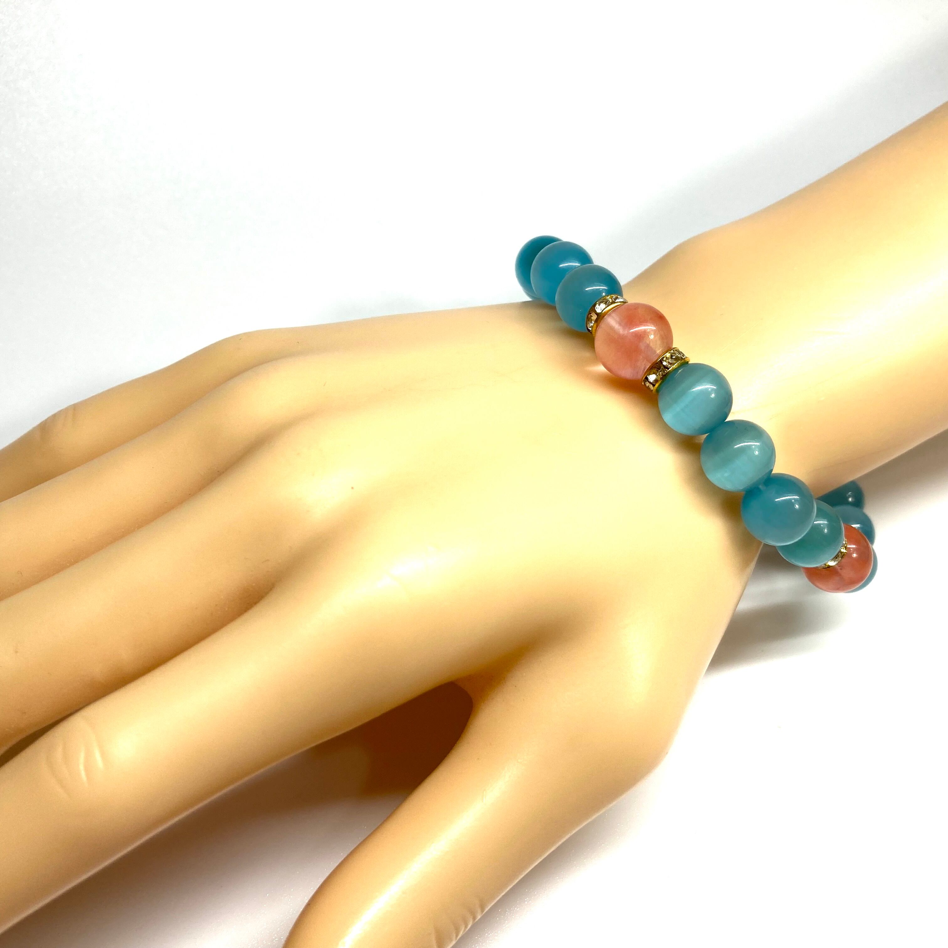 こちらは、キャッツアイとチェリークォーツを組み合わせたブレスレットです。間にはロンデルを挟み高級感あるデザインに仕上がっています。石大きさは腕にも馴染みやすいように10mm玉で内周約17cm(伸可能)です。数に限りがございますので気になる方はお早めにどうぞ。