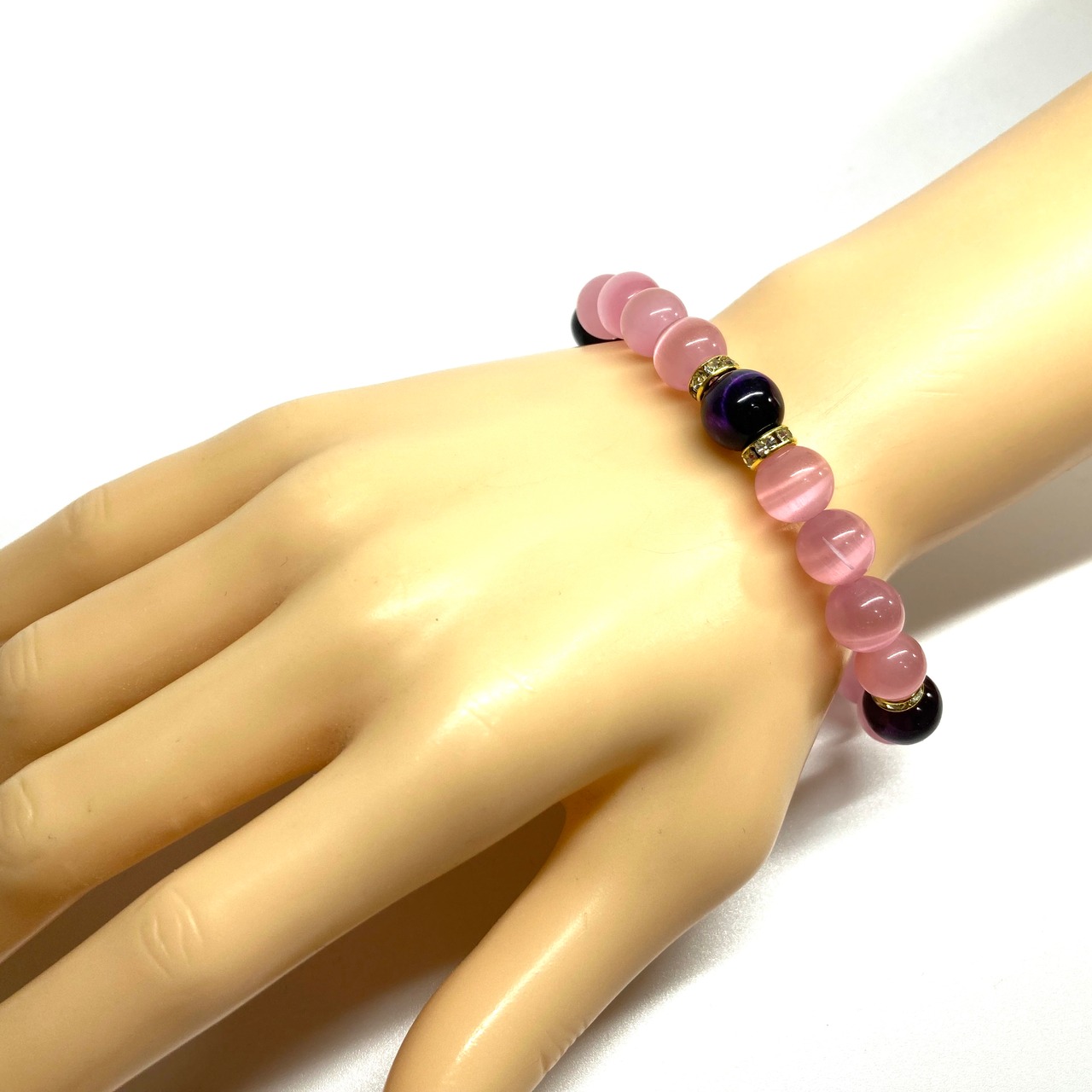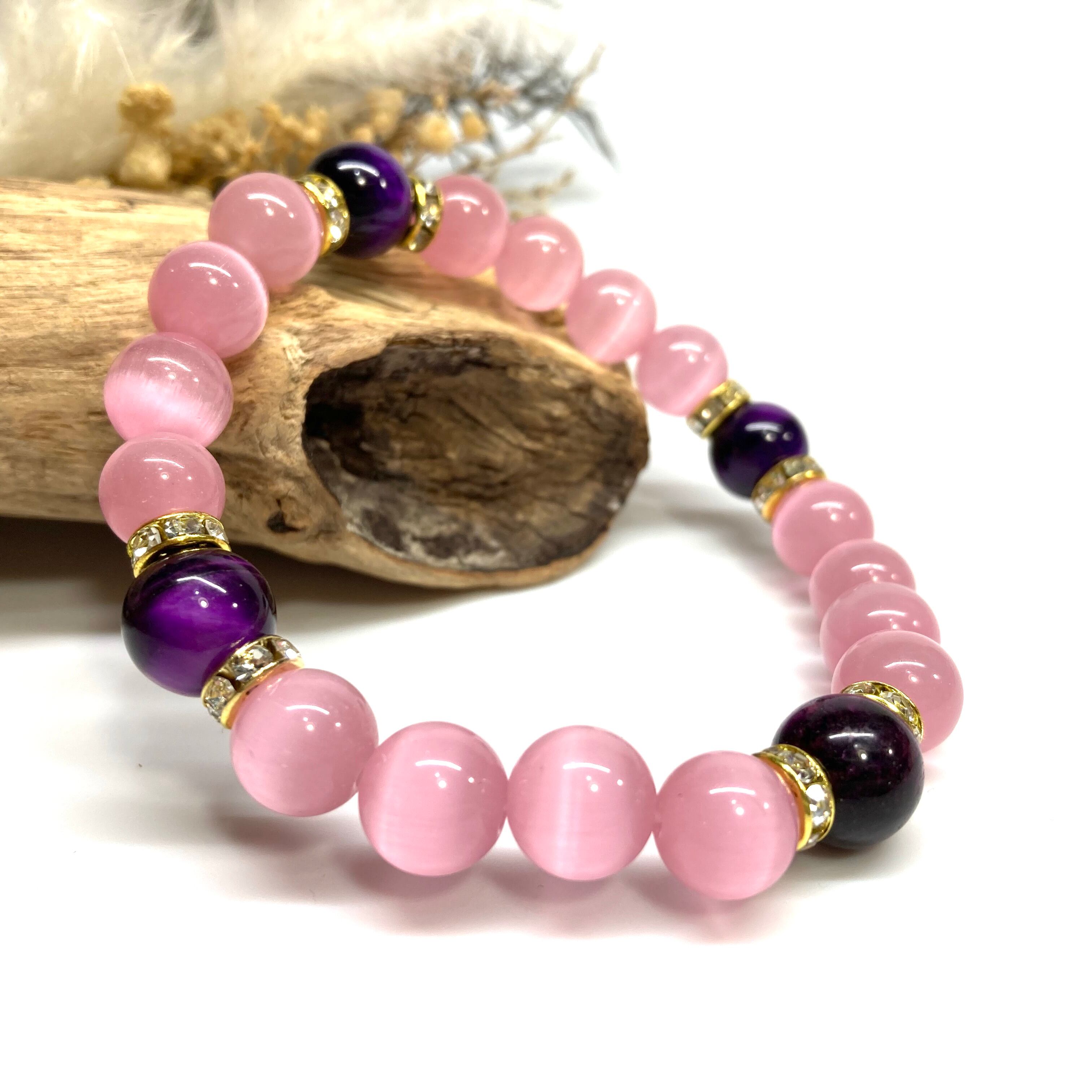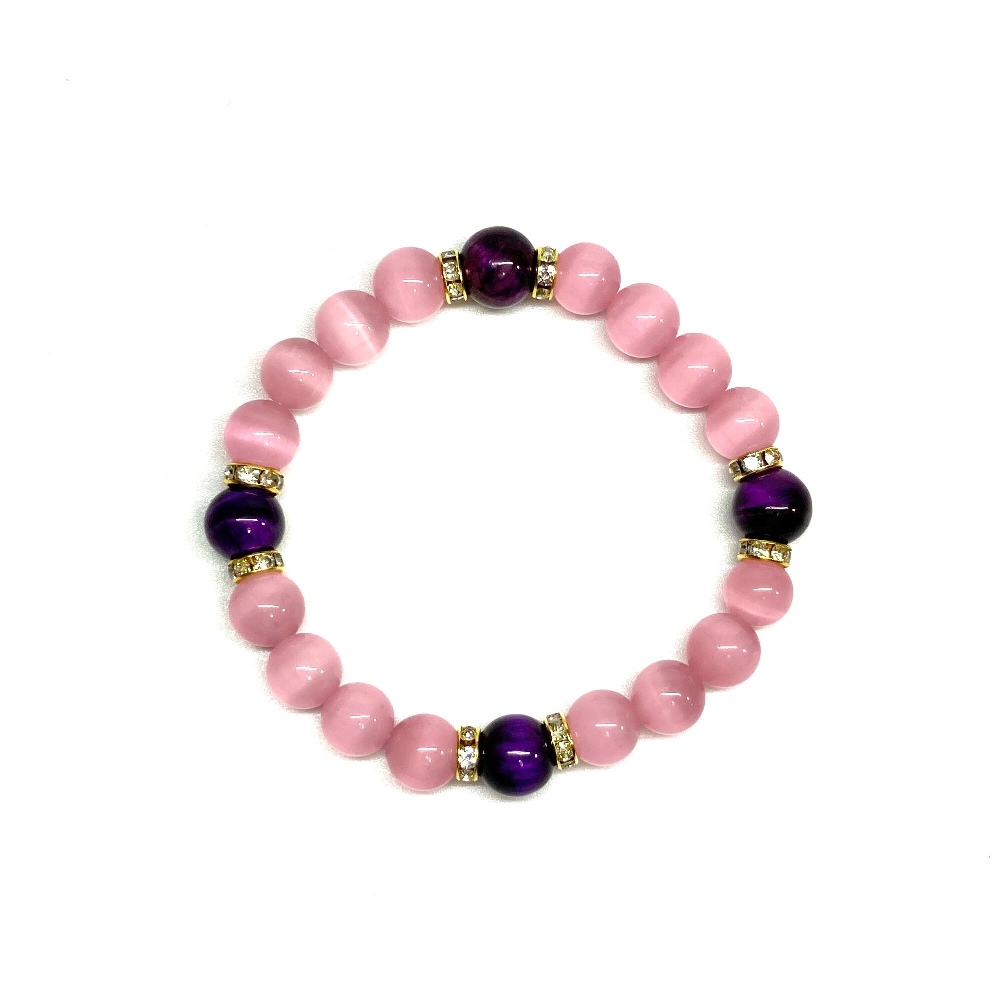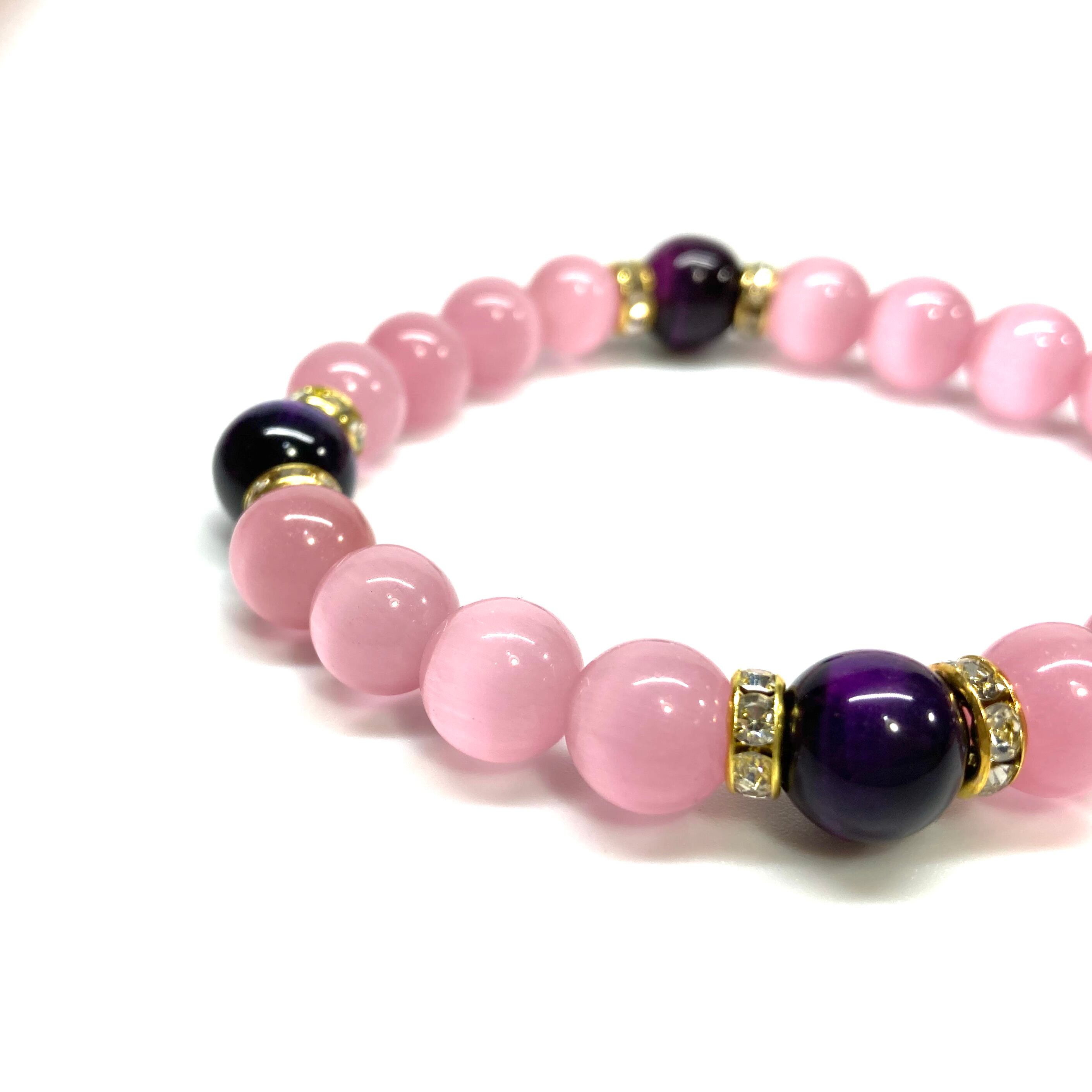 キャッツアイ(ピンク)×パープルタイガーアイ パワーストーン ブレスレット (ゴールド) メンズ・レディース 男性・女性 数珠ブレス 開運