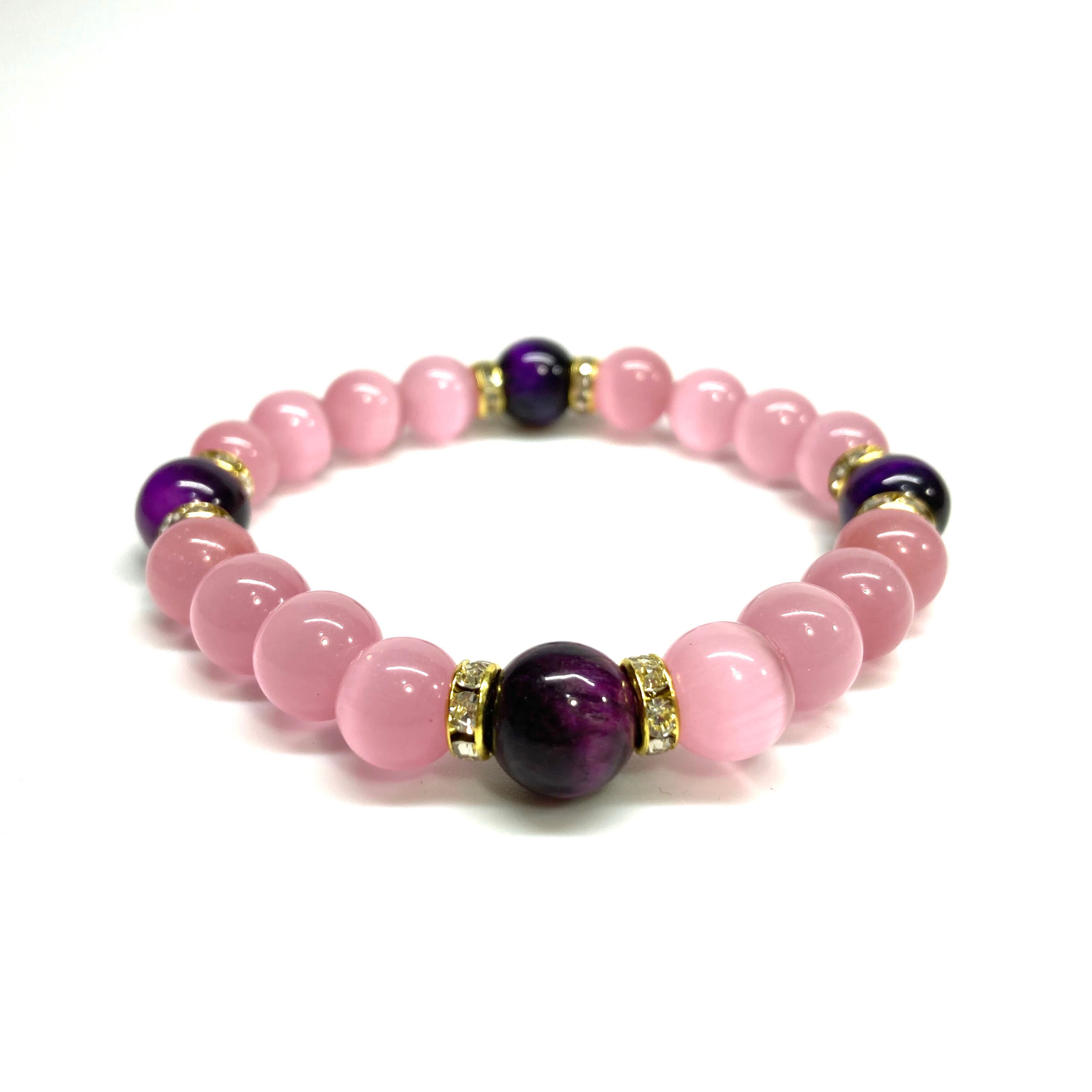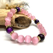 こちらは、キャッツアイとパープルタイガーアイを組み合わせたブレスレットです。間にはロンデルを挟み高級感あるデザインに仕上がっています。石大きさは腕にも馴染みやすいように10mm玉で内周約17cm(伸可能)です。数に限りがございますので気になる方はお早めにどうぞ。