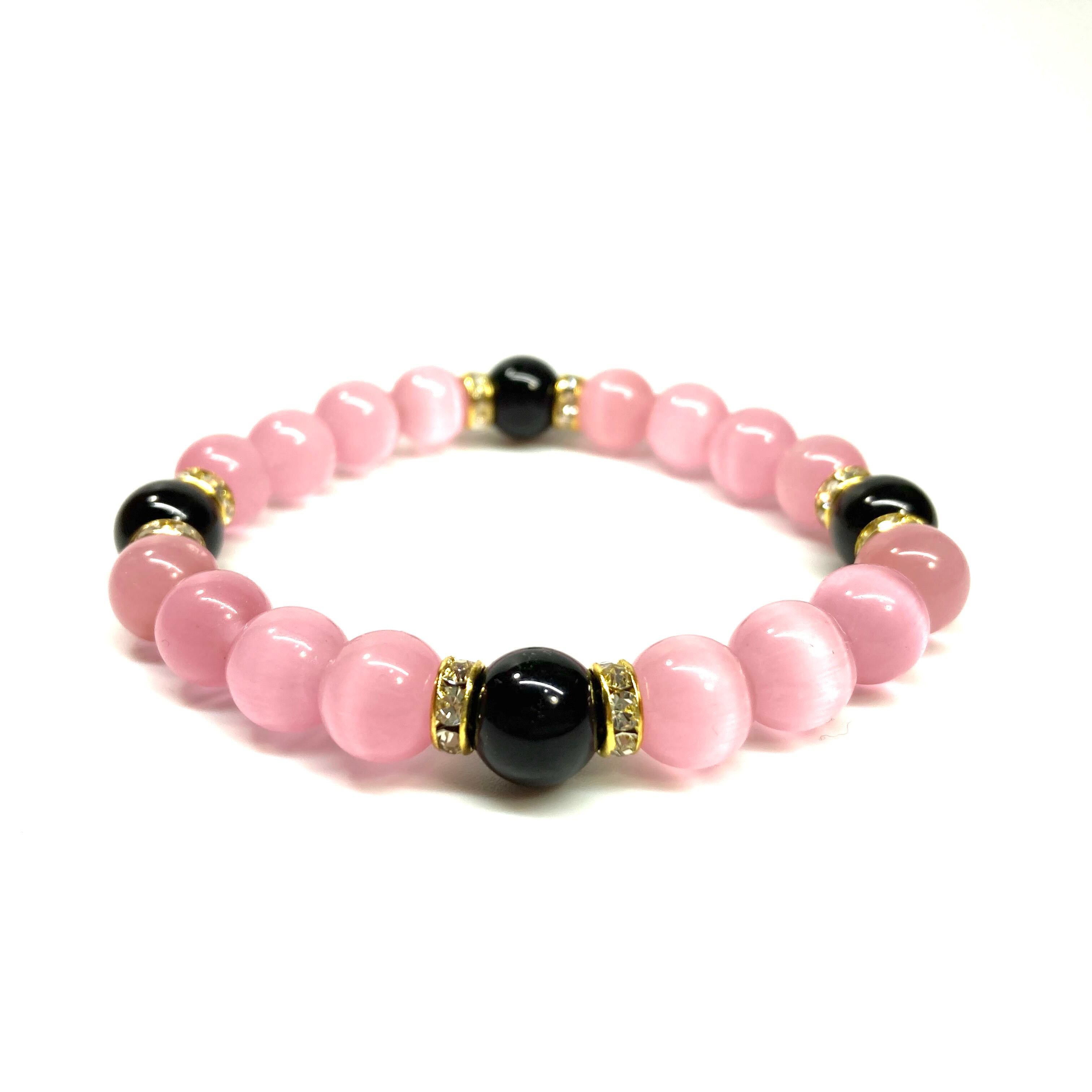 キャッツアイ(ピンク)×オニキス パワーストーン ブレスレット (ゴールド) メンズ・レディース 男性・女性 数珠ブレス 開運