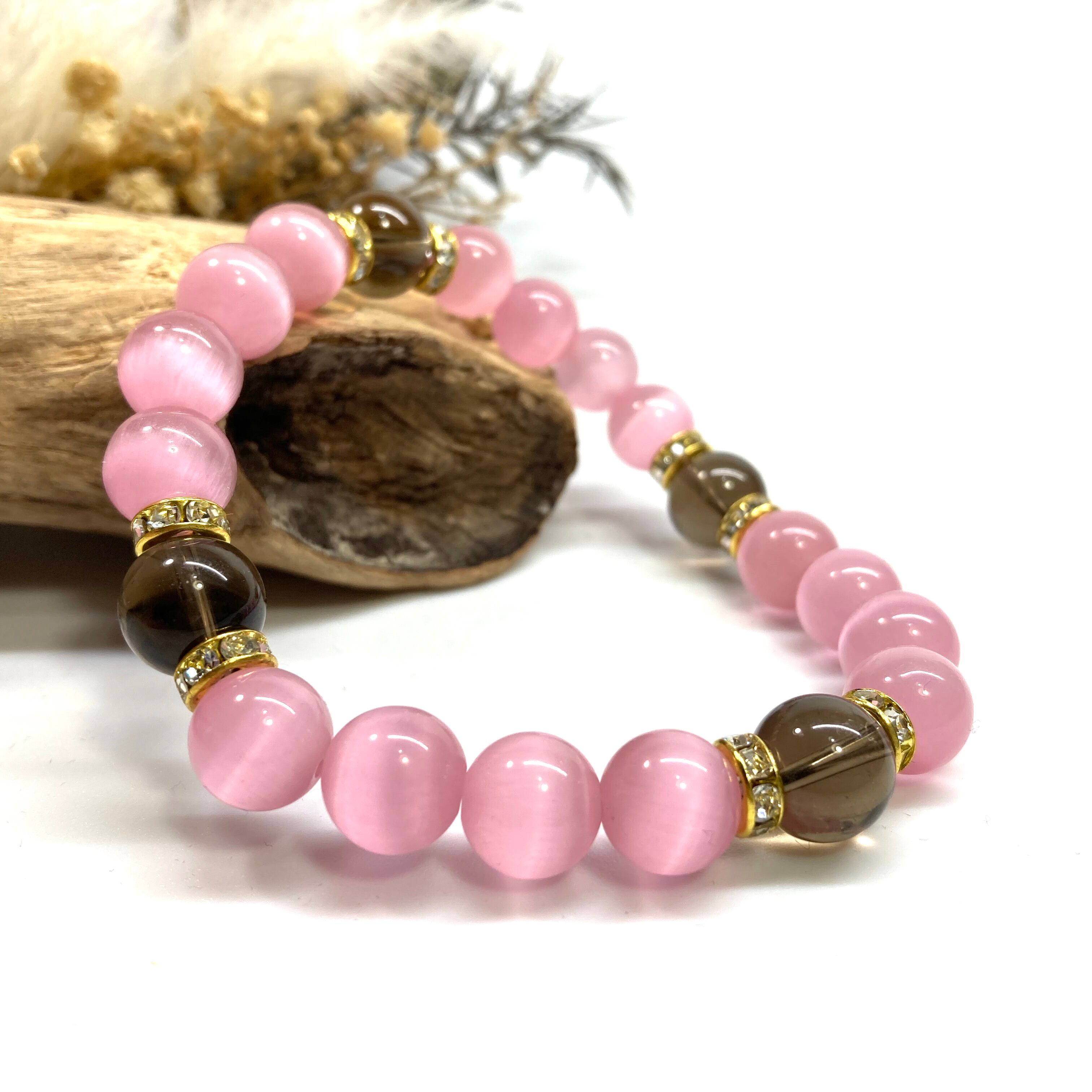 キャッツアイ(ピンク)×スモーキークォーツ パワーストーン ブレスレット (ゴールド) メンズ・レディース 男性・女性 数珠ブレス 開運