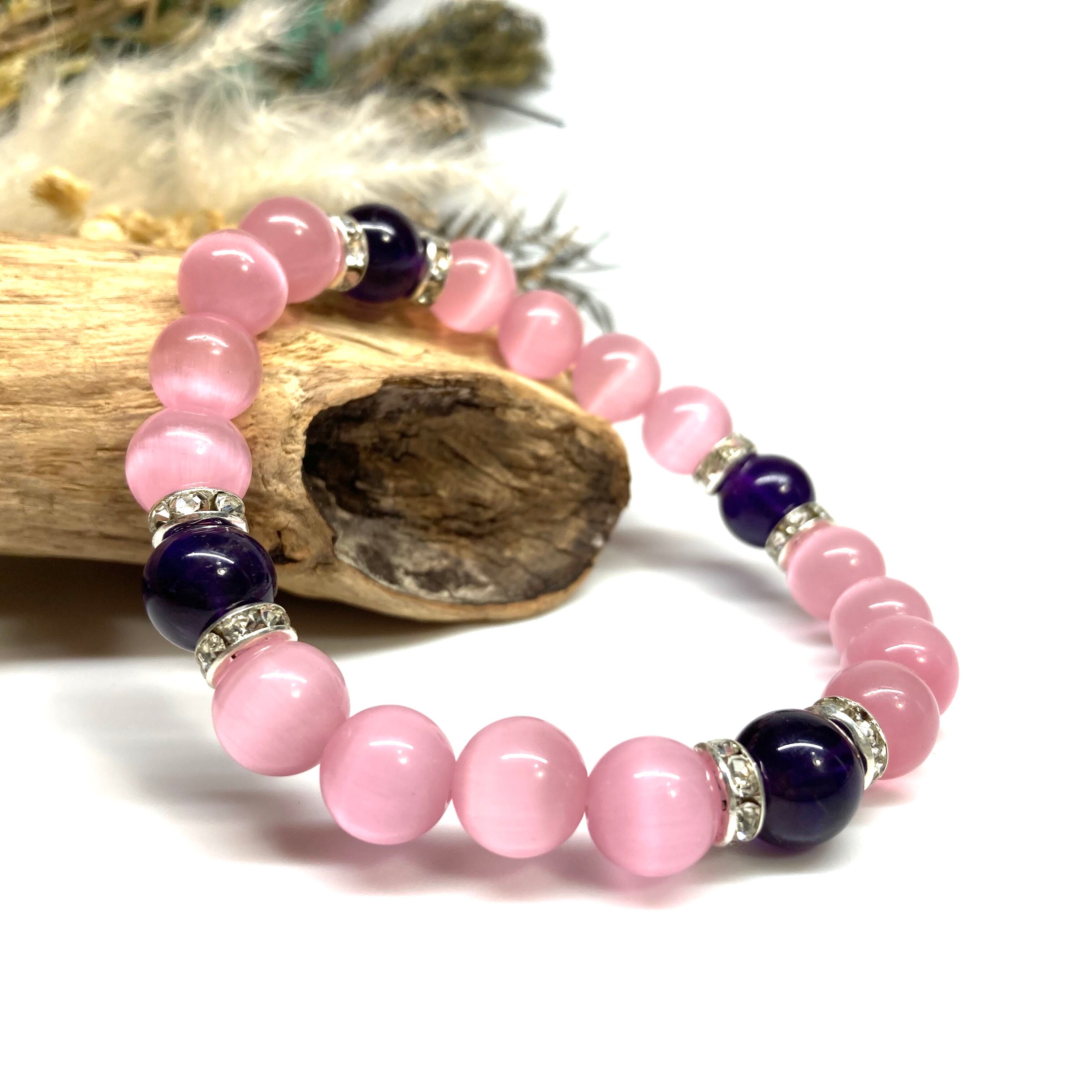 キャッツアイ(ピンク)×アメジスト パワーストーン ブレスレット (シルバー) メンズ・レディース 男性・女性 数珠ブレス 開運