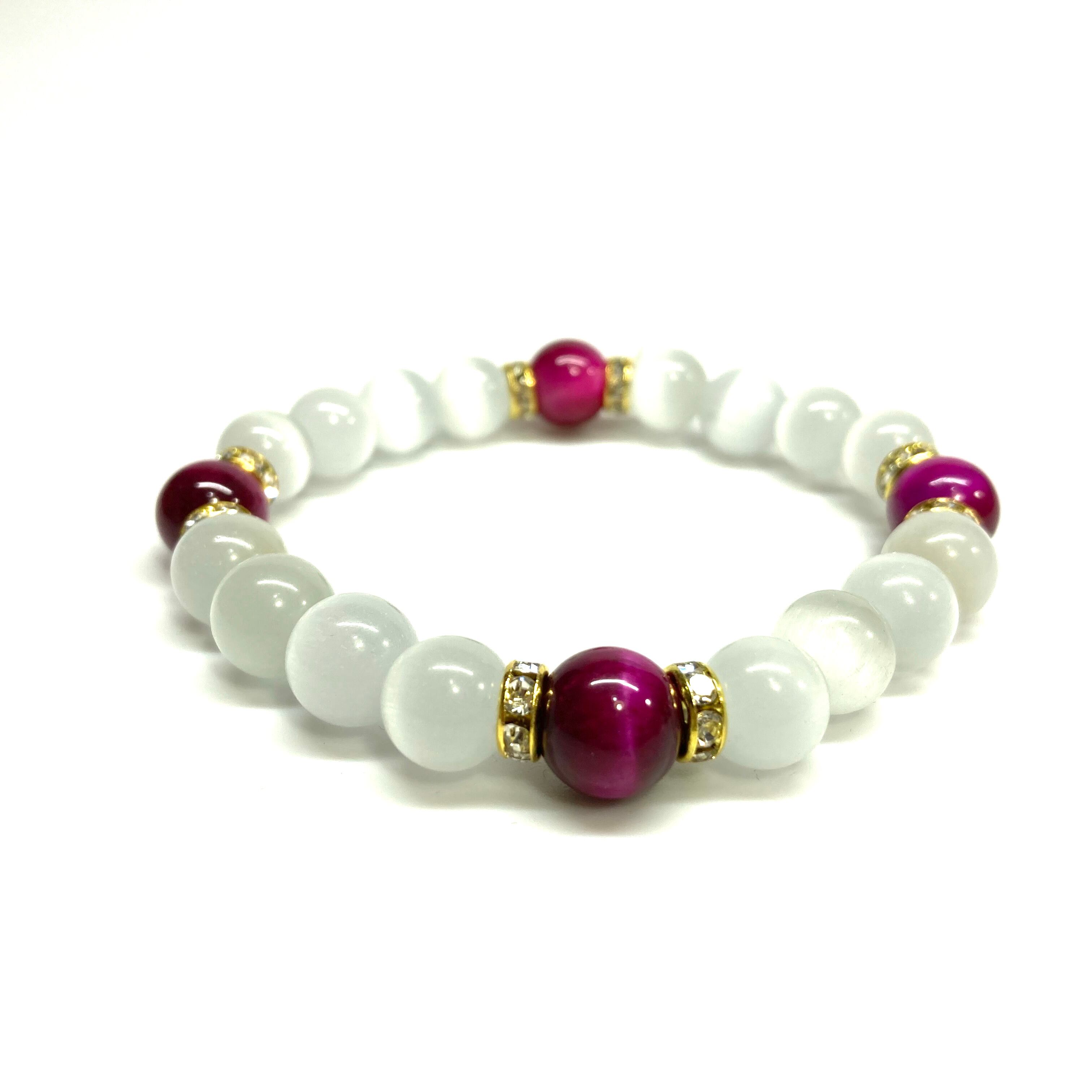 こちらは、キャッツアイとピンクタイガーアイを組み合わせたブレスレットです。間にはロンデルを挟み高級感あるデザインに仕上がっています。石大きさは腕にも馴染みやすいように10mm玉で内周約17cm(伸可能)です。数に限りがございますので気になる方はお早めにどうぞ。