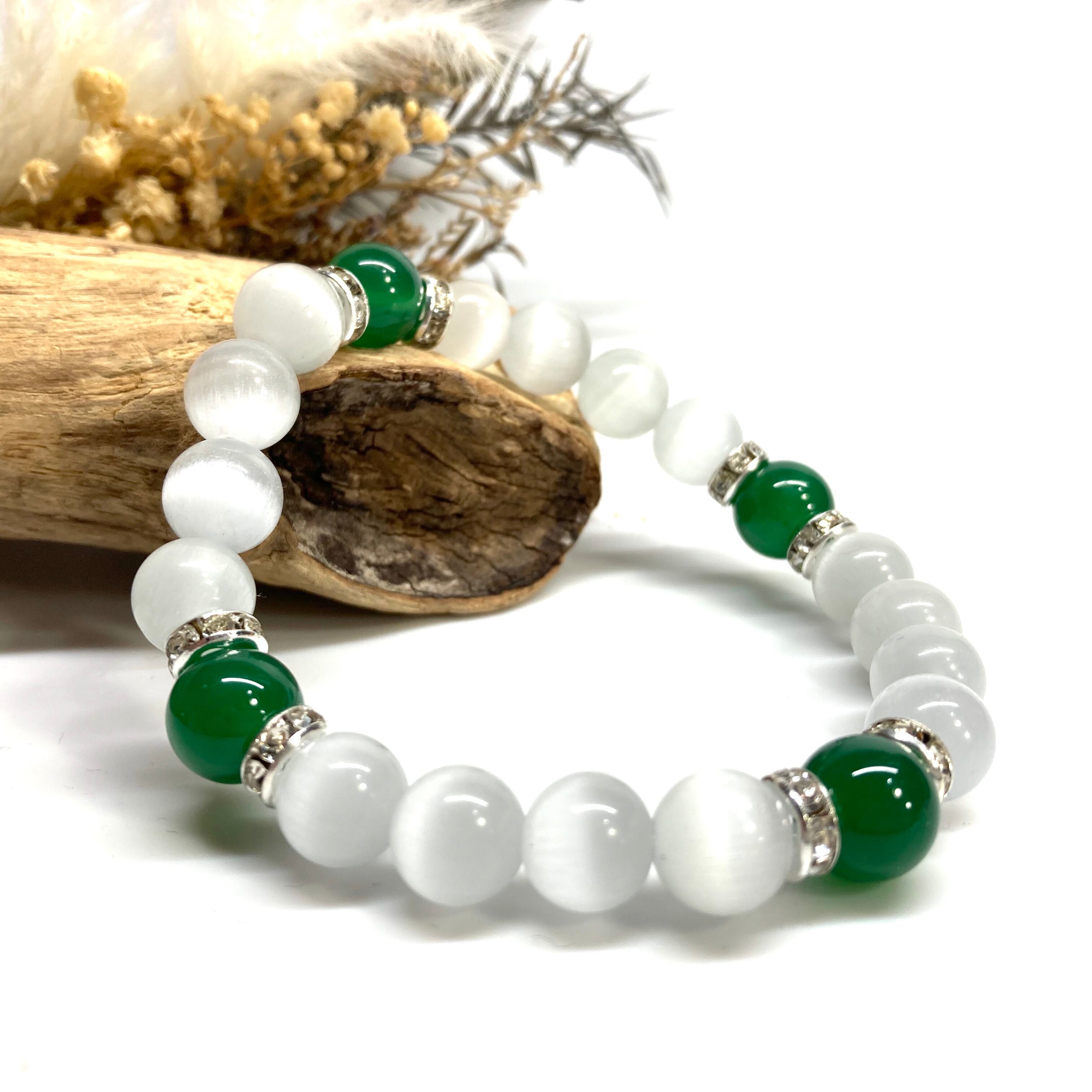キャッツアイ(ホワイト)×緑瑪瑙 パワーストーン ブレスレット (シルバー) メンズ・レディース 男性・女性 数珠ブレス 開運