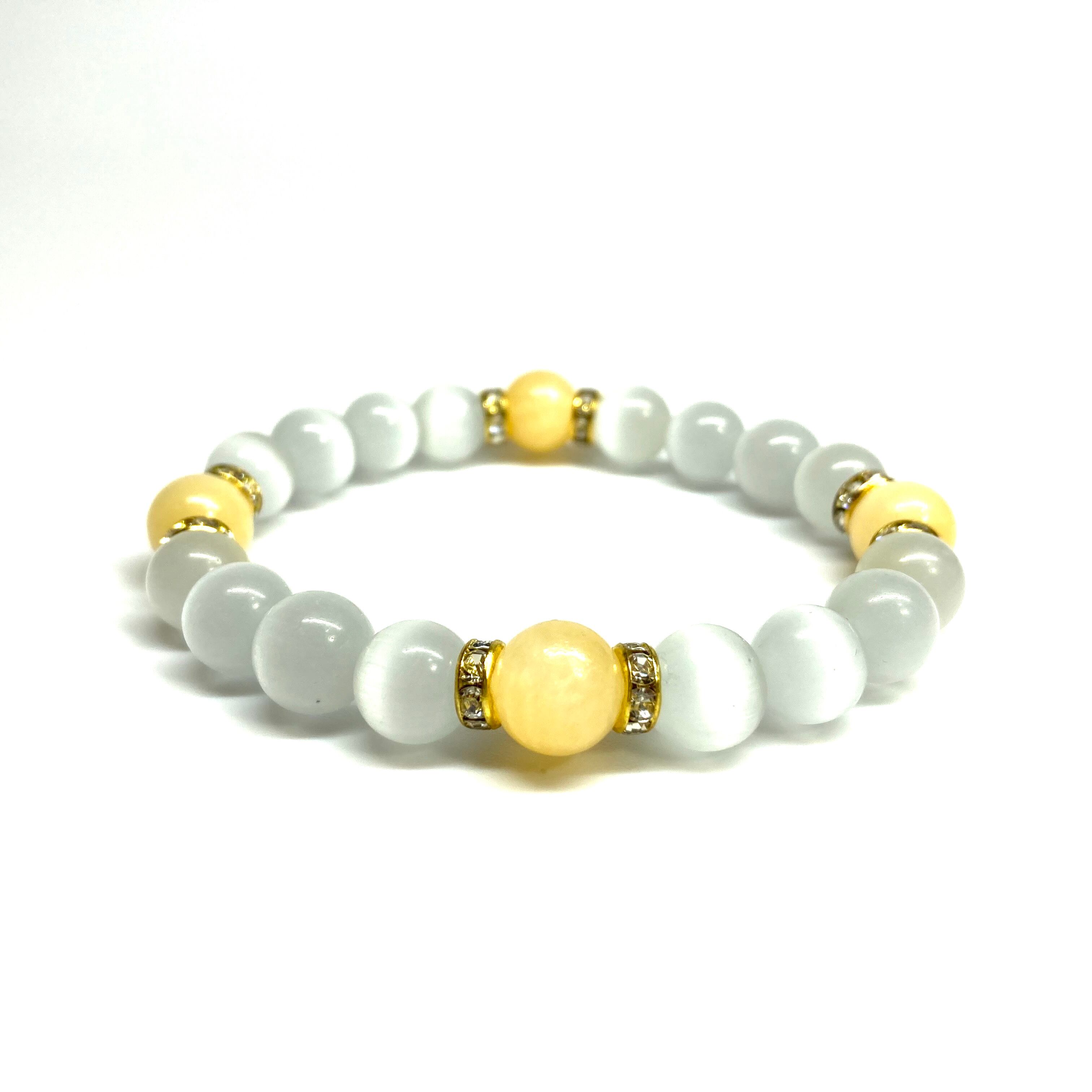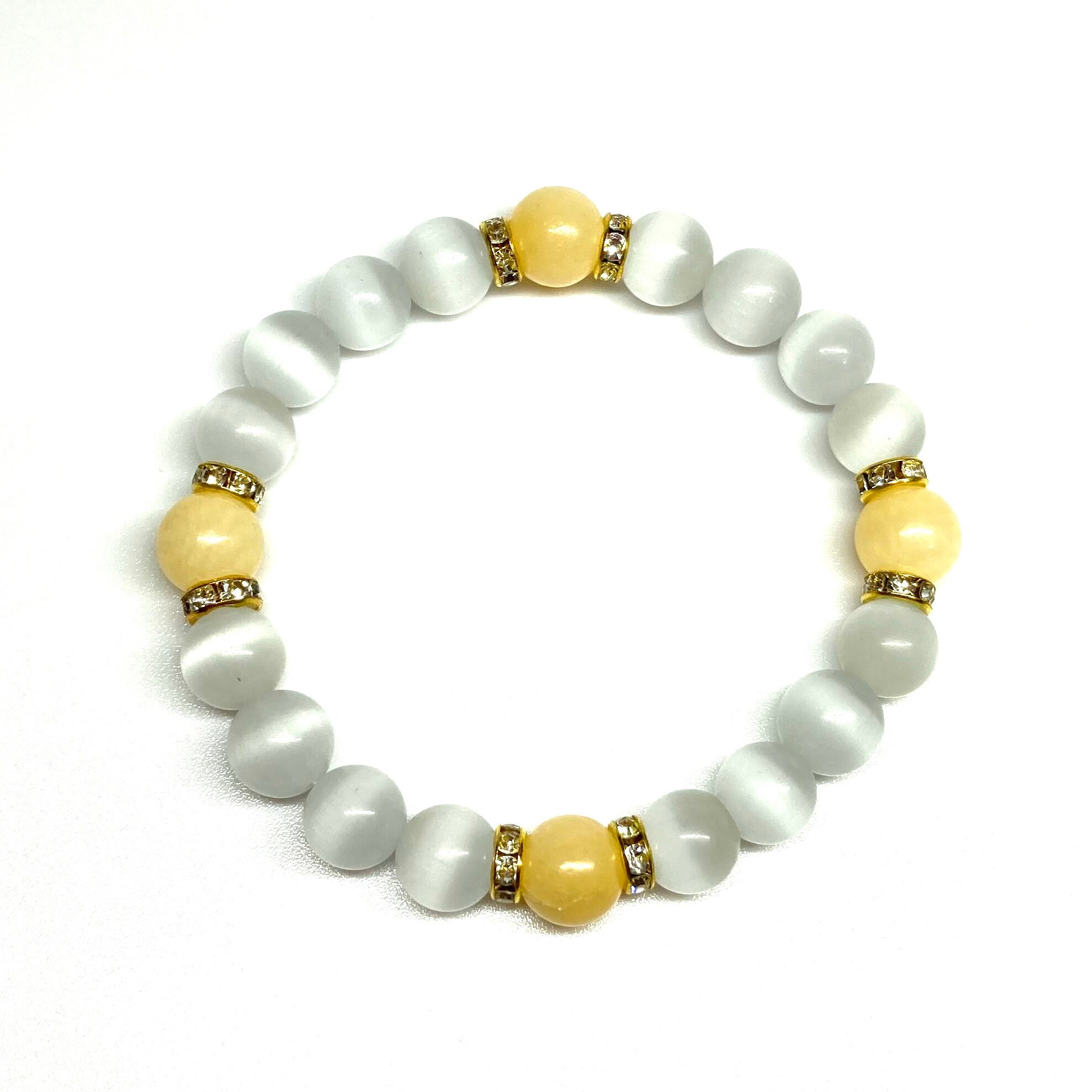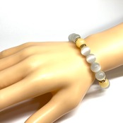 こちらは、キャッツアイとアラゴナイトを組み合わせたブレスレットです。間にはロンデルを挟み高級感あるデザインに仕上がっています。石大きさは腕にも馴染みやすいように10mm玉で内周約17cm(伸可能)です。数に限りがございますので気になる方はお早めにどうぞ。